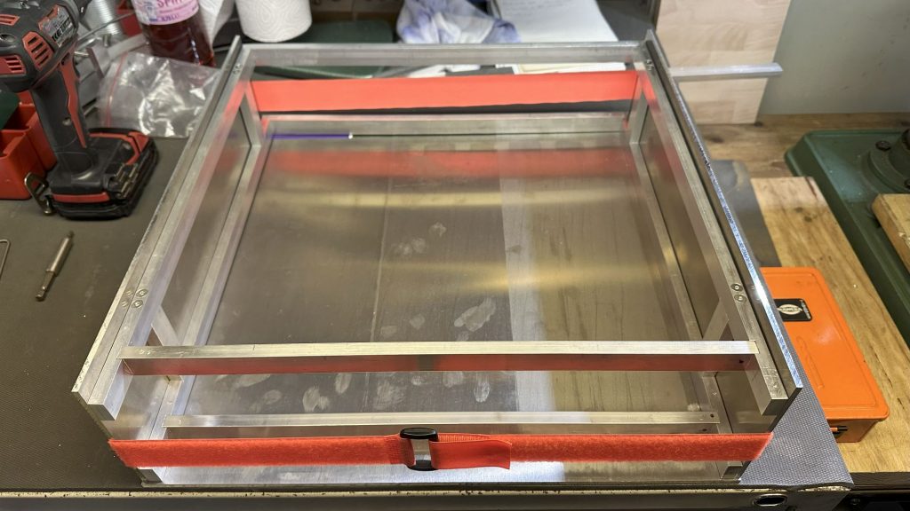 Hier ist der komplette Rahmen zu sehen, an dem provisorisch die Seitenbleche fixiert wurden. Das Ganze liegt auf dem Kopf, sodass die große unten liegende Platte später die Oberseite des Verstärkers bilden soll.